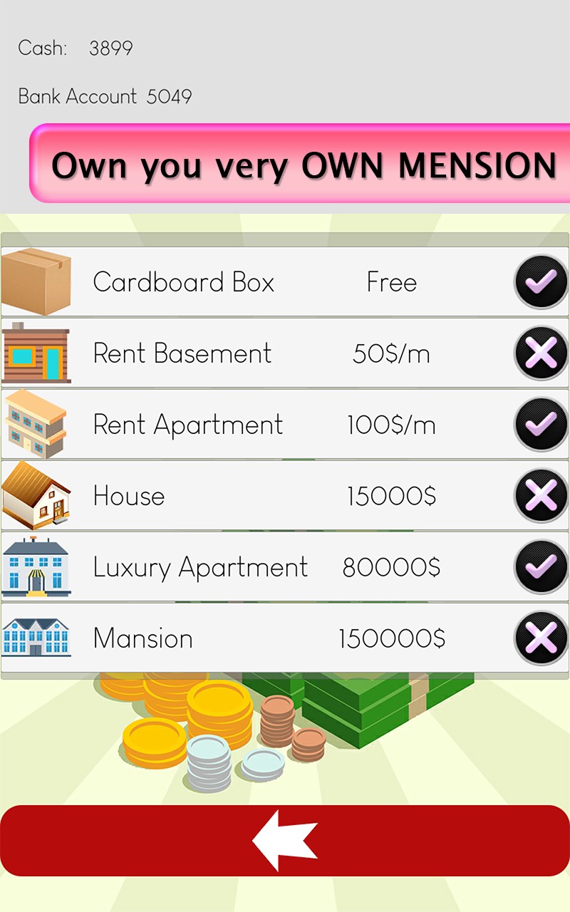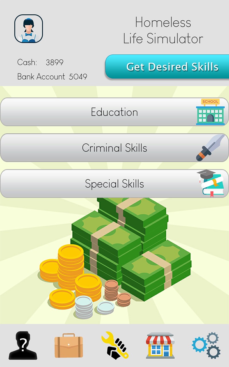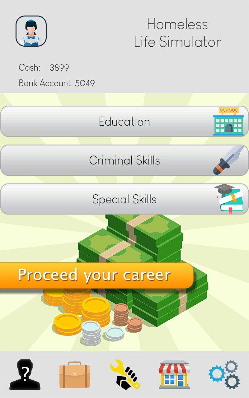Life is hard and only the best can survive. Virtual Life simulation is an addicting game to make your life whatever you want it to be. This is a simulation game of your life. Your job is to make money and get richer in any way possible you want. You have lost everything and were on the streets. You start the game as a complete homeless person. Your target is to become a multi millionaire tycoon. You can earn money by begging, working a job or by doing illegal things. Begin your new life as a homeless guy who has no money, education or skills. Decide your life purpose and choose wisely your career from decent or criminal directions and live your life accordingly. Either learn education and improve white collar job opportunities or learn criminal skills for the immediate shortcut shelter. Also improve your personal skills like Driving, Management, Law or Business. Rent a basement or buy a luxury apartment or villa as you get richer and say goodbye to street life. Grow up experiencing new things from environment and create your own success story and become the richest person.