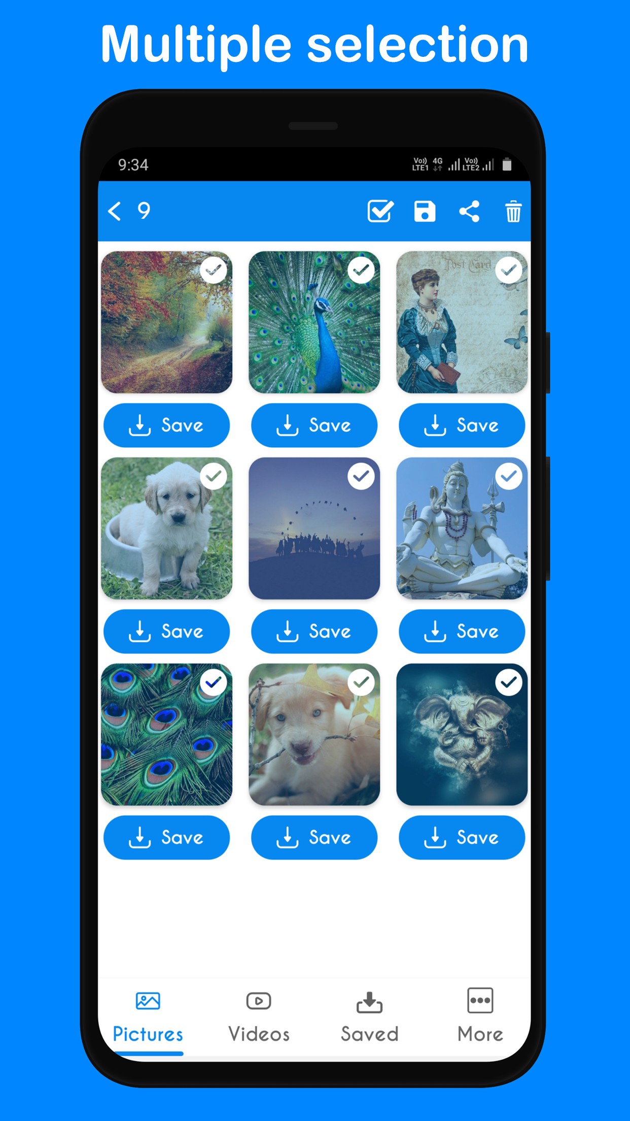 Select all the Statuses you want to Save,Share or Delete & Click on Appropriate Option in the toolbar.