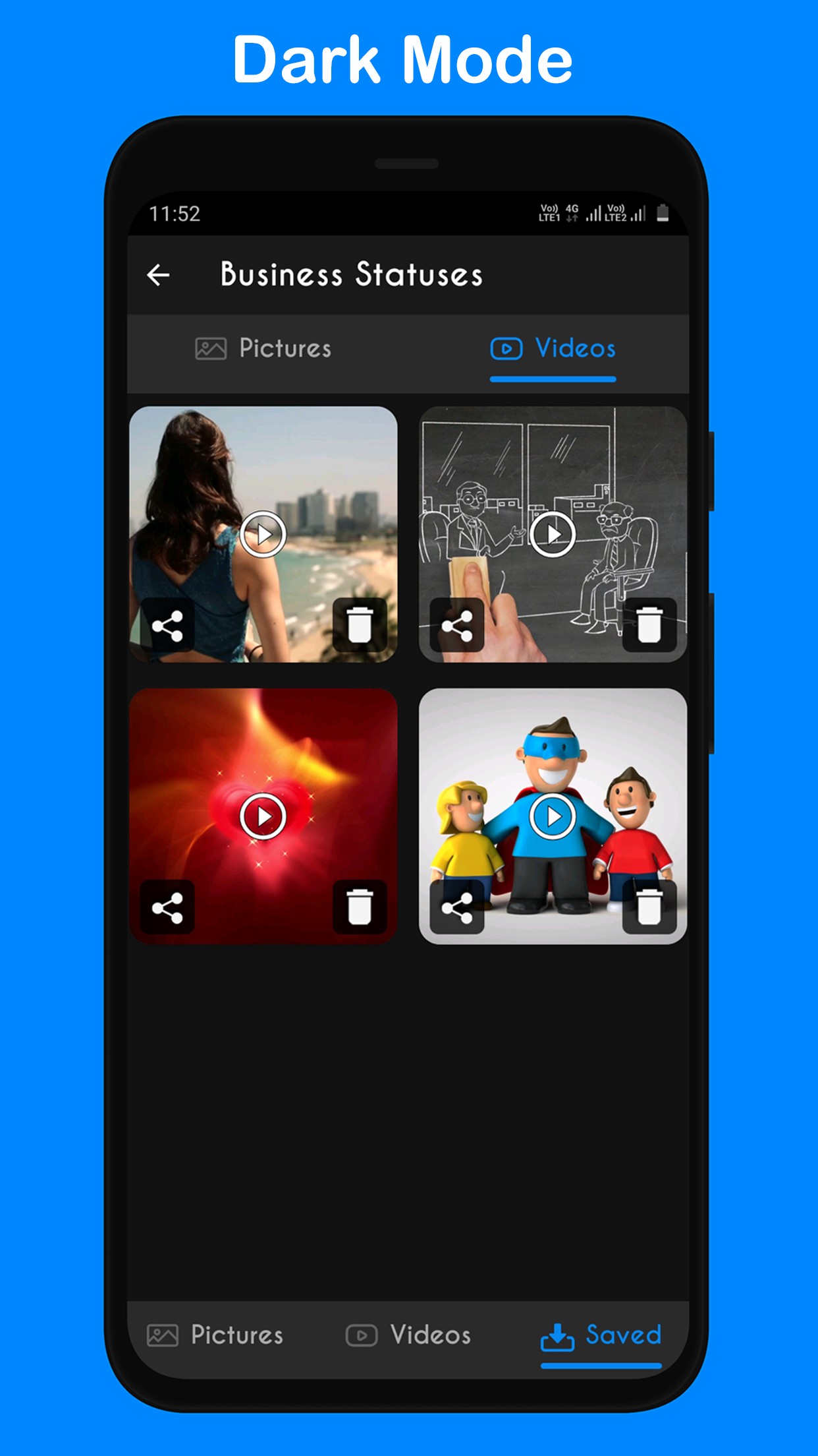 Nowadays all people share their current situation using whatsapp status and share their mood. So you can use our WAStatusSaver app to save and share status. WAStatusSaver app is very easily use. And this app provides dark mode so your mobile battery performance is high.