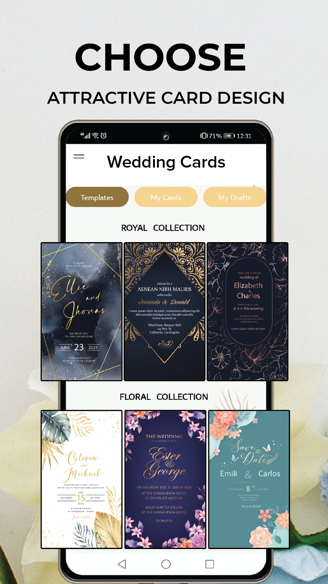 Wedding Invitation Card Maker is an app that assists you to design Stunning Cards for everyone so that people can celebrate joys on the occasion for their loved ones. in this era of digitalization, making cards is not difficult anymore however there are a lot of other tools that are not providing special features to create captivating cards. This Tool always helps you to design a magnificent invitation card that everyone loves and depending on your need what kind of card you want to design so that people who are so special in your life can love it. This tool is easy to use you can create your custom card or get templates for invitations. it just takes a few steps to design beautiful cards that do not take your time. you see the magic of Elegance. This app has incredible specialties along with great templates with beautiful writing fonts.