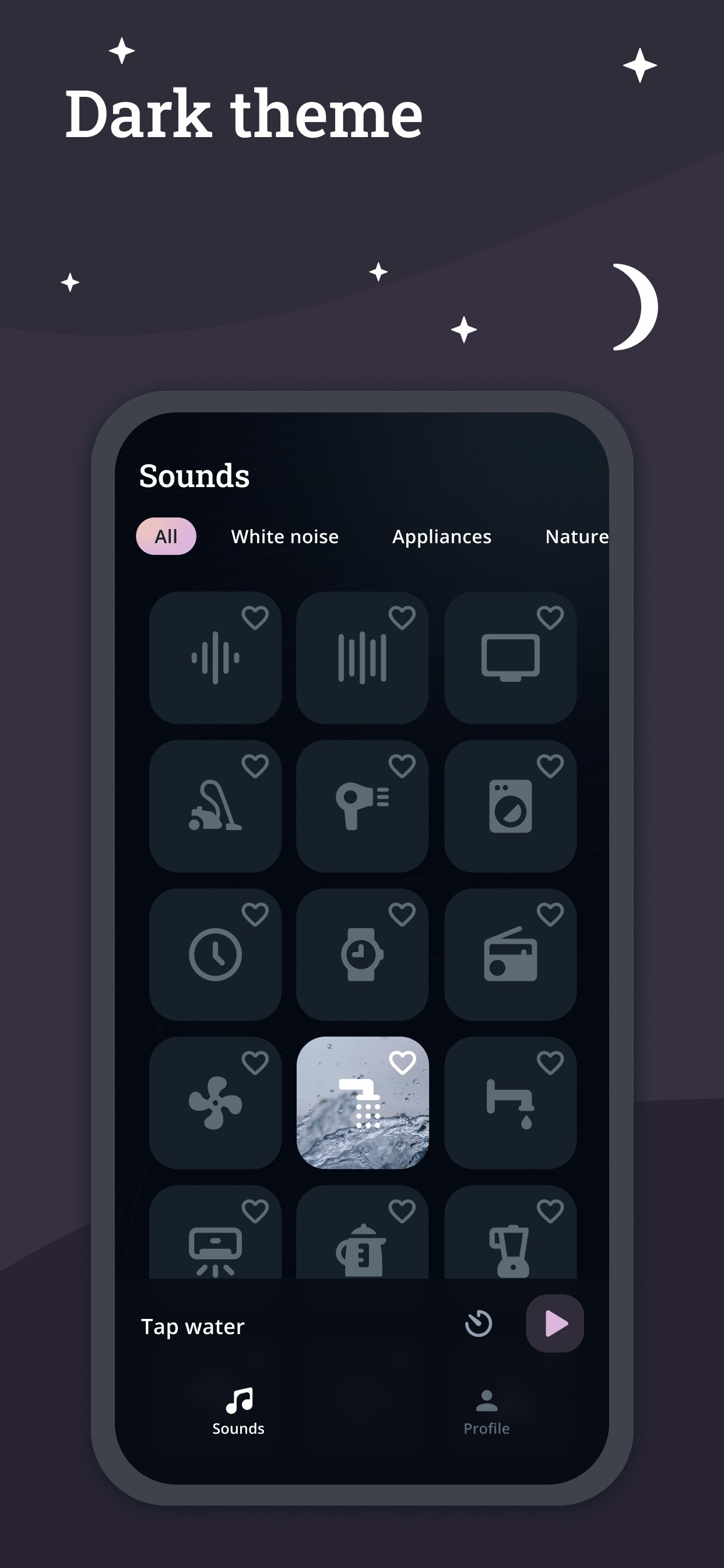 What if there are no such sounds? Use a mobile gadget with many preset white noise options! Our application can make different tones that have a positive effect on the child's sleep: