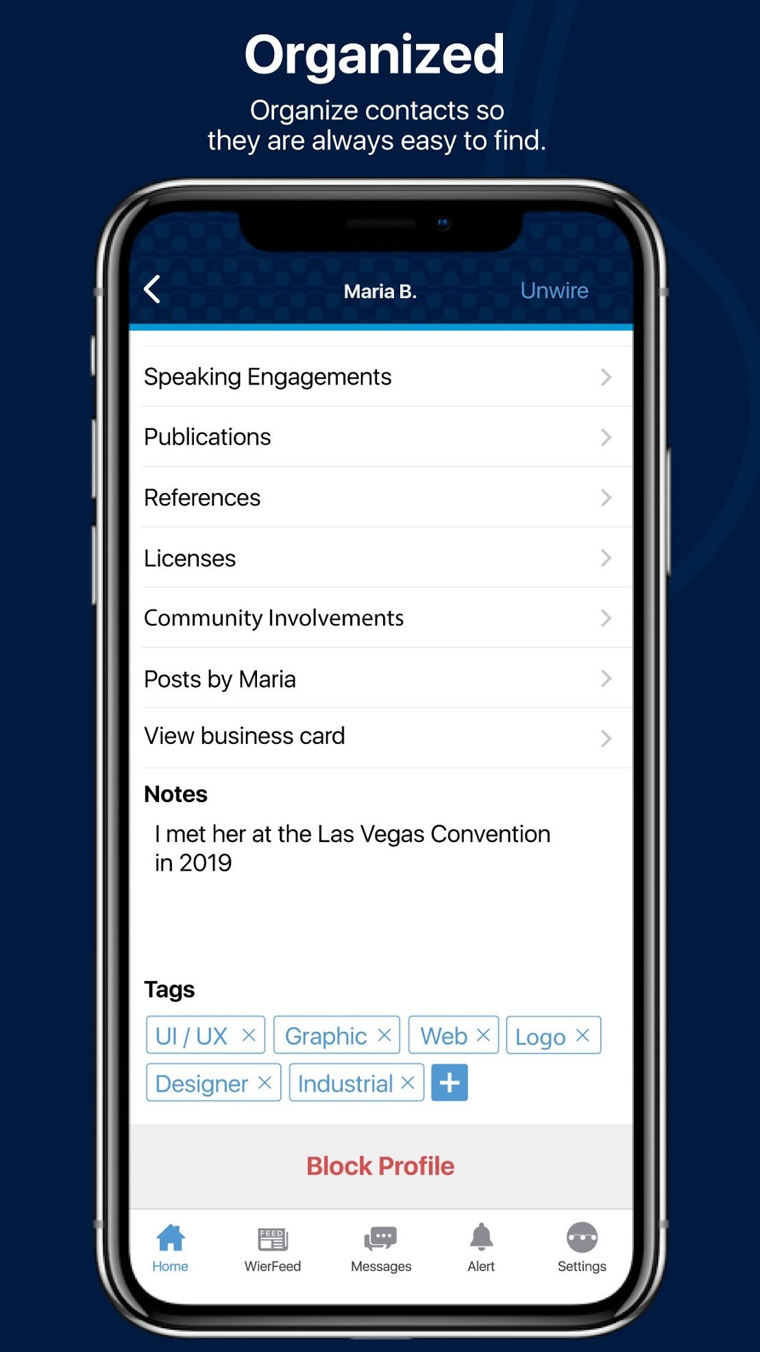 Notes and tags for digital business cards: Search for and find contacts by tagging. Make notes for yourself to remember your business contacts.