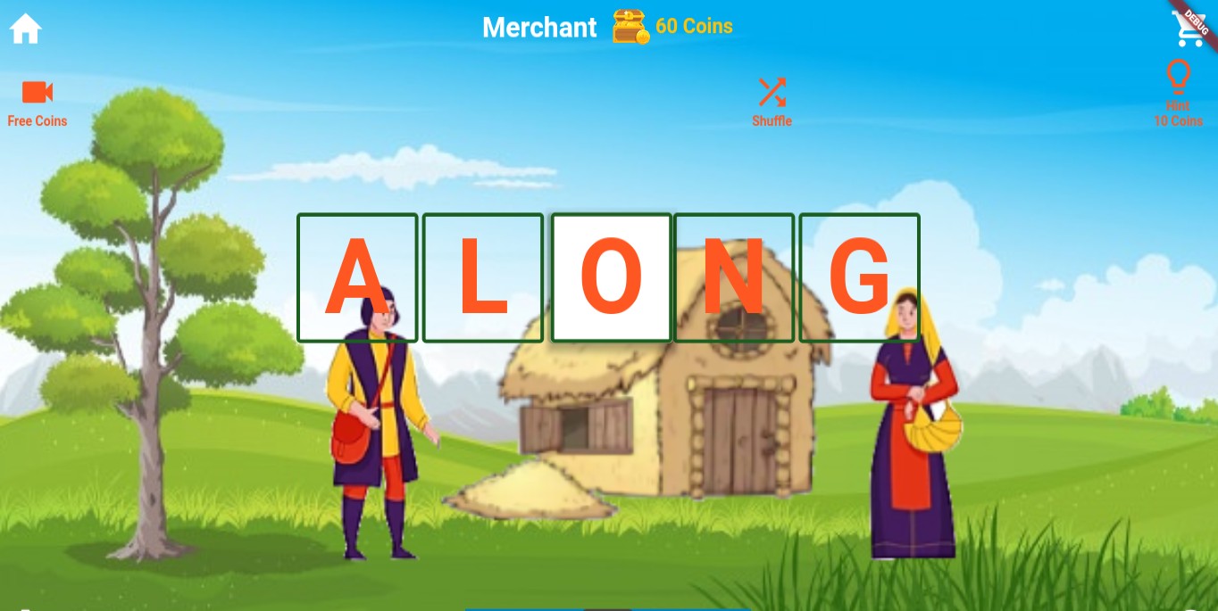 Unscramble the words in the Word Kingdom to go from Peasant to King and Queen and rule the kingdom. There are seven levels in the Kingdom: Peasant, Merchant, Squire/Maiden, Knight, Duke/Duchess, Prince/Princess, King/Queen. Each level has ten groups with 10 scrambled words per group. Words become longer as you move up the levels. Solve a group and earn coins that enable you to use hints and buy a house for that level.
