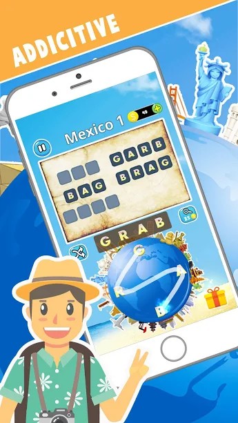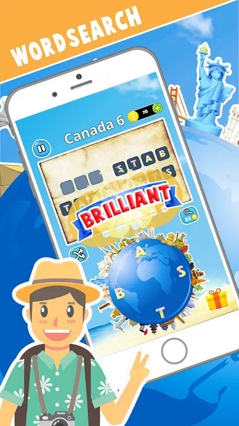 Get ready for the ultimate word-search challenge with this free brain training game for all to enjoy. “Search for words” and make as many words as you can! Pass levels in each country, collect coins and unlock new levels in **Word Travel Search Puzzle**
