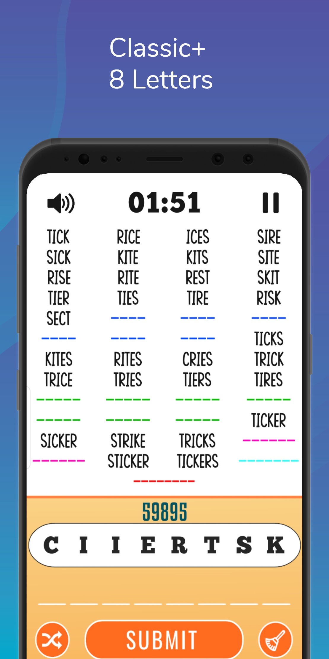 A supersized game mode in which you are given 12 letters, two of which offer bonus points - 2x and a 3x word score multipliers. In this mode, time increases as you get words, so you can rack up a super score!