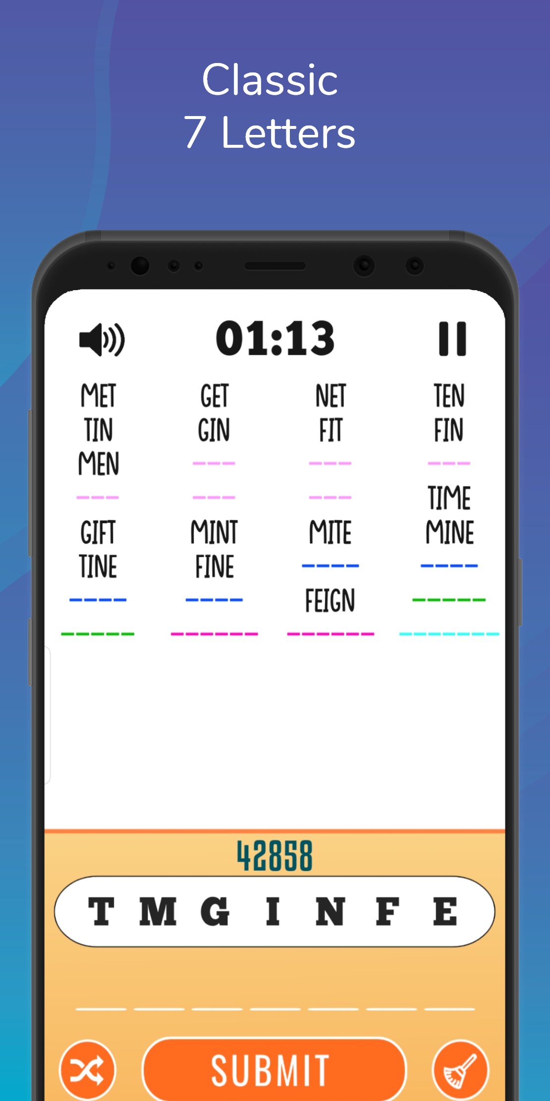 You are given 7 letters and a game board filled with all possible words (hidden until you guess them). The colored dashes seen on the board indicate the size of the word hidden behind them. Get as many words as you can before the timer runs out!