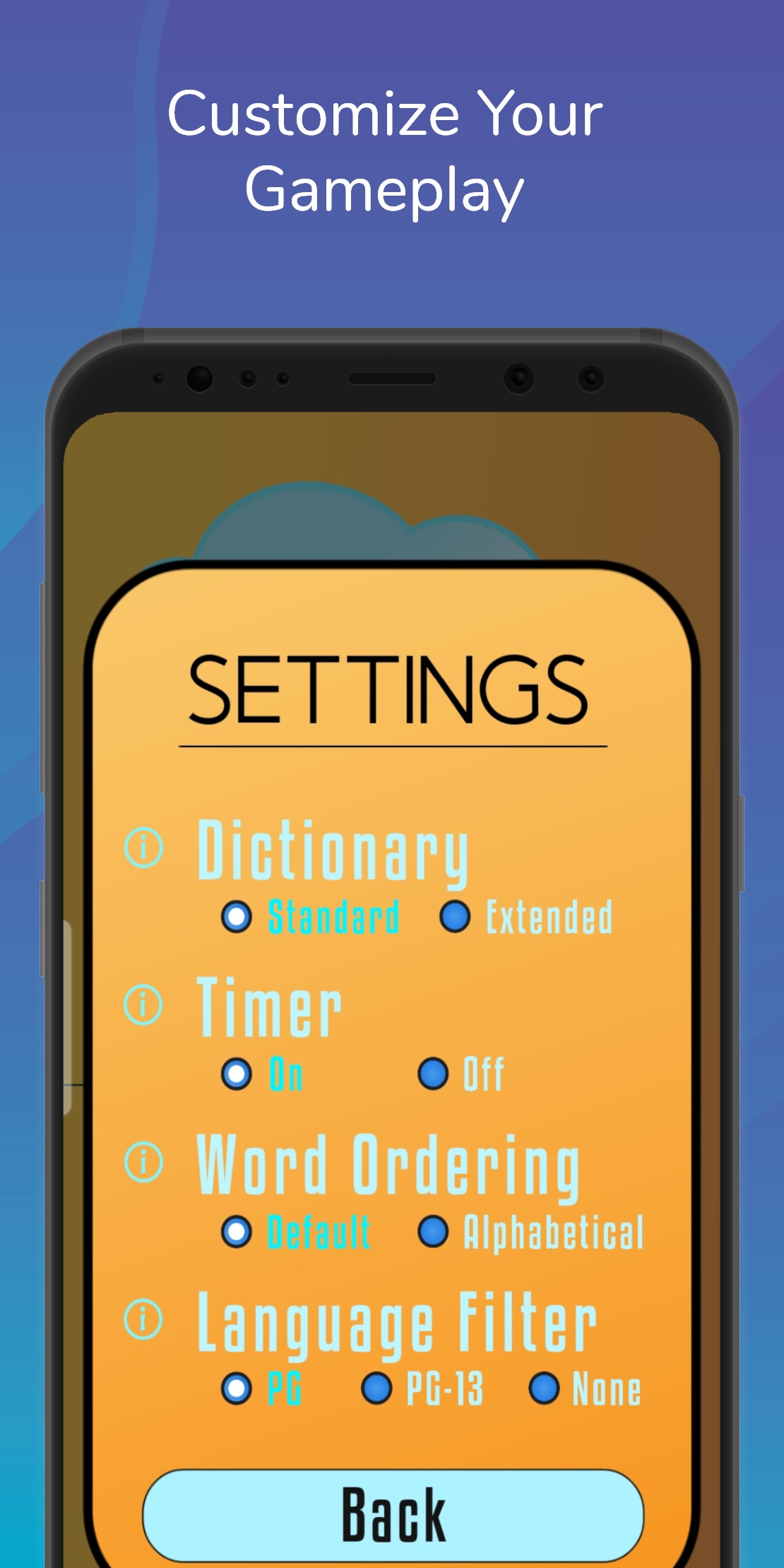 * Language Filter - allows you to eliminate inappropriate words from the game based on your desired maturity level (PG, PG-13, or None).