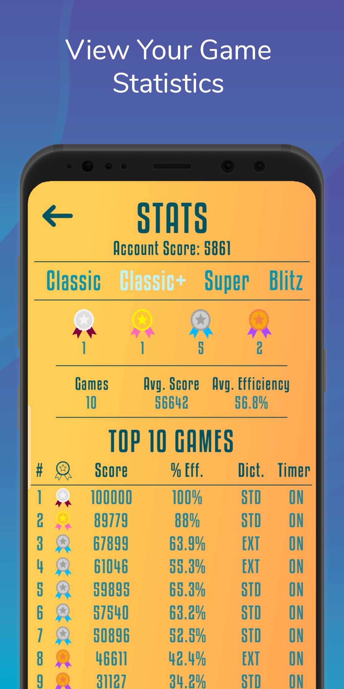 * Standard or Extended Dictionary - Standard contains significantly fewer obscure words, so it is recommended for the typical player. This only applies to Classic and Classic+ games; Super and Blitz always use Extended.