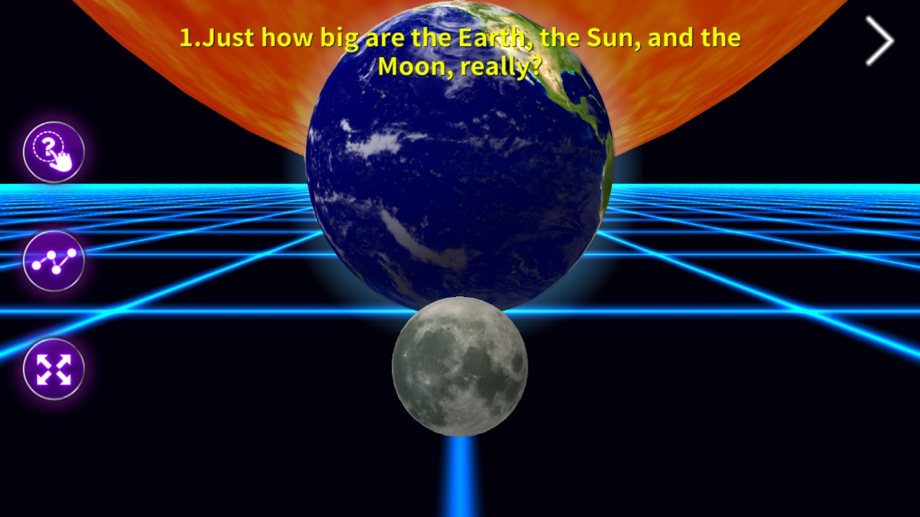 Feel the answers through 3D simulations while following the steps, beginning with comparisons of the sizes of the Sun, the Moon, and the Earth.