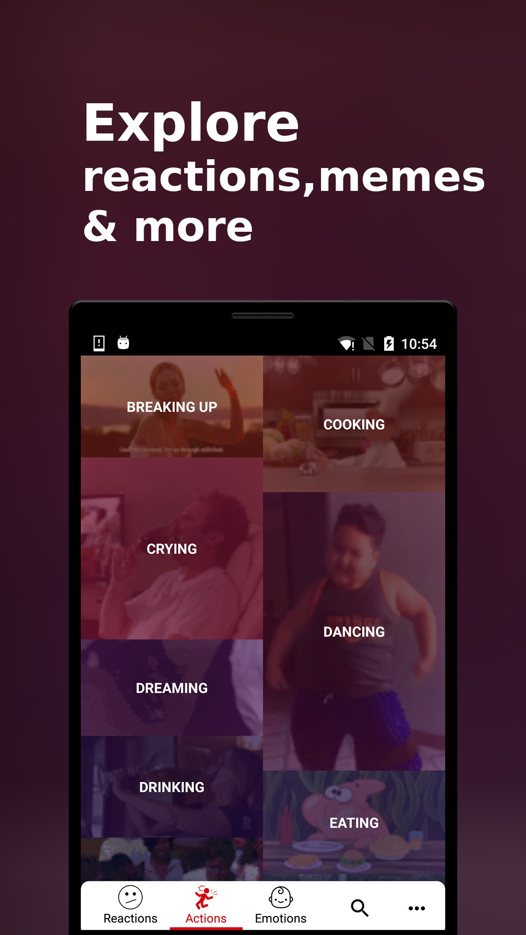 • Explore gifs from many topics (reactions, actions, memes, tv, stickers...)