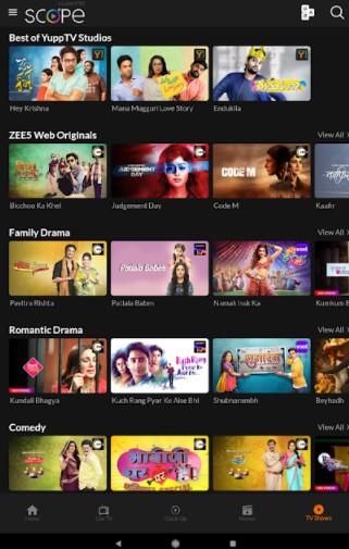 YuppTV Scope is an OTT aggregator app that provides users curated content across multiple OTT apps. This app has the best content in 12+ languages, 100+ Originals, 300+ Live TV Channels, 500+ TV Shows, 8000+ Movies....and Many more. This app also features Live streaming, Catch-up Tv, Content suggestions, TV recording, and schedule...etc.